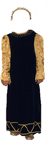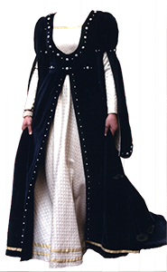 Gli abiti dai colori vari come il giallo, il blu, il rosso, il bianco, il viola, il bordò, il rosa , l’azzurro, il verde e l’arancio sono cuciti a mano, con stoffe pregiate come il velluto e il damasco, rifiniti e impreziositi con passamaneria d’oro e perle bianche.